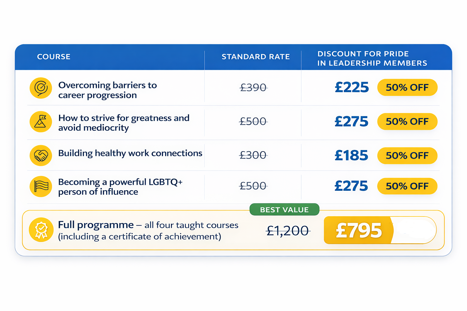 This programme is for LGBTQ+ professionals at any stage of their career; whether you are self-employed, work in a large organisation, or are just planning your next step.